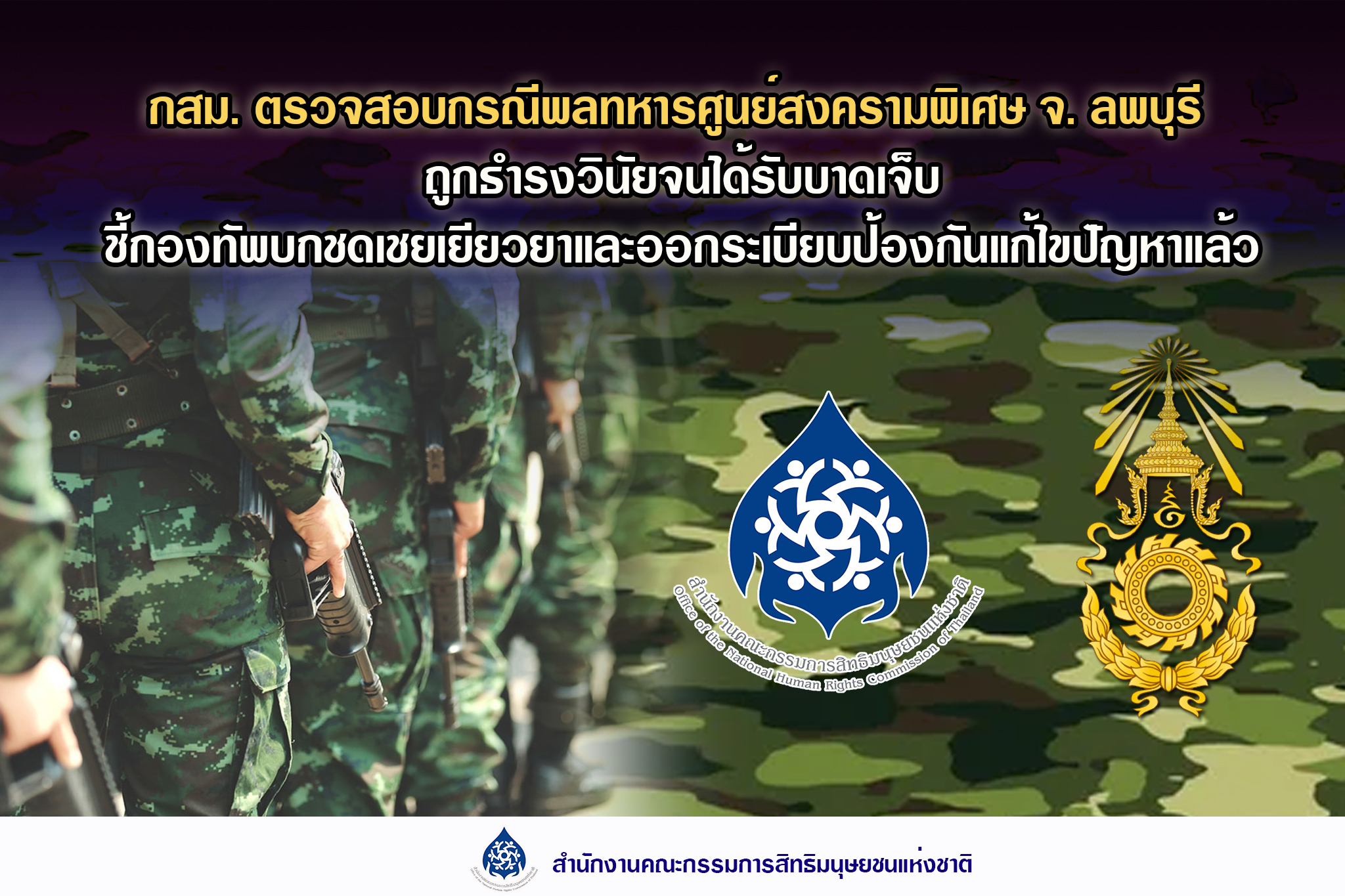 1. กสม. ตรวจสอบกรณีพลทหารศูนย์สงครามพิเศษ จ. ลพบุรี ถูกธำรงวินัยเกินกว่าเหตุจนได้รับบาดเจ็บ ชี้กองทัพบกชดเชยเยียวยาและออกระเบียบป้องกันแก้ไขปัญหาแล้ว