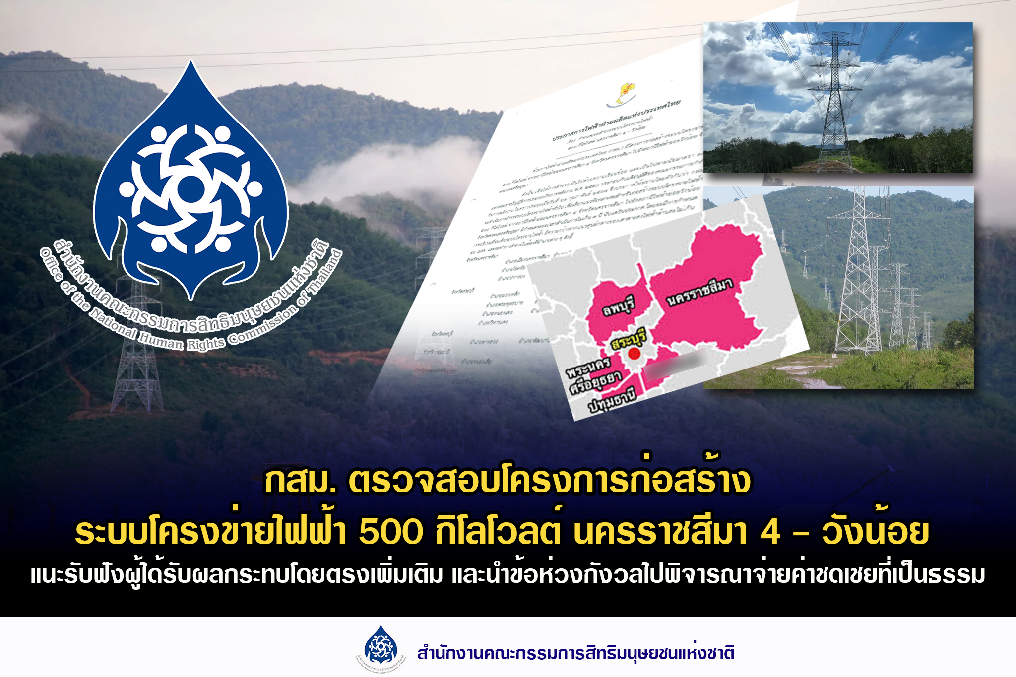 นายนฤนาท  คุ้มไพบูลย์ ผู้อำนวยการสำนักคุ้มครองสิทธิมนุษยชน 2 เปิดเผยว่า คณะกรรมการสิทธิมนุษยชนแห่งชาติ (กสม.) ได้รับเรื่องร้องเรียนจากประชาชน 4 ราย เมื่อเดือนเมษายน 2568 ระบุว่า คณะกรรมการกำกับกิจการพลังงาน (ผู้ถูกร้อง) ได้พิจารณาให้ความเห็นชอบทิศทางและแนวเขตในการวางระบบโครงข่ายไฟฟ้าของการไฟฟ้าฝ่ายผลิตแห่งประเทศไทย (กฟผ.) ในโครงการก่อสร้างระบบโครงข่ายไฟฟ้า 500 กิโลโวลต์ นครราชสีมา 4 – วังน้อย โดยกำหนดให้พื้นที่แนวเขตระบบโครงข่ายไฟฟ้าเริ่มต้นจากสถานีไฟฟ้าย่อยนครราชสีมา 4 ตำบลโคกไทย อำเภอปักธงชัย จังหวัดนครราชสีมา ไปยังสถานีไฟฟ้าย่อยวังน้อย ตำบลข้าวงาม อำเภอวังน้อย จังหวัดพระนครศรีอยุธยา ระยะทางรวมกว่า 232 กิโลเมตร พาดผ่านพื้นที่ 48 ตำบล 11 อำเภอ 3 จังหวัด ได้แก่ จังหวัดนครราชสีมา จังหวัดสระบุรี และจังหวัดพระนครศรีอยุธยา โดยขาดการมีส่วนร่วมของประชาชนในพื้นที่และไม่เป็นไปตามขั้นตอนที่กฎหมายกำหนด ซึ่งอาจกระทบต่อสิทธิชุมชนและสิทธิของบุคคลในทรัพย์สิน จึงขอให้ตรวจสอบ