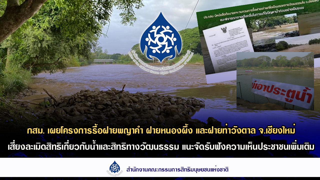1. กสม. เผยผลการตรวจสอบโครงการรื้อฝายพญาคำ ฝายหนองผึ้ง และฝายท่าวังตาล จ.เชียงใหม่ ชี้เสี่ยงละเมิดสิทธิเกี่ยวกับน้ำและสิทธิทางวัฒนธรรม แนะจัดรับฟังความเห็นประชาชนเพิ่มเติม