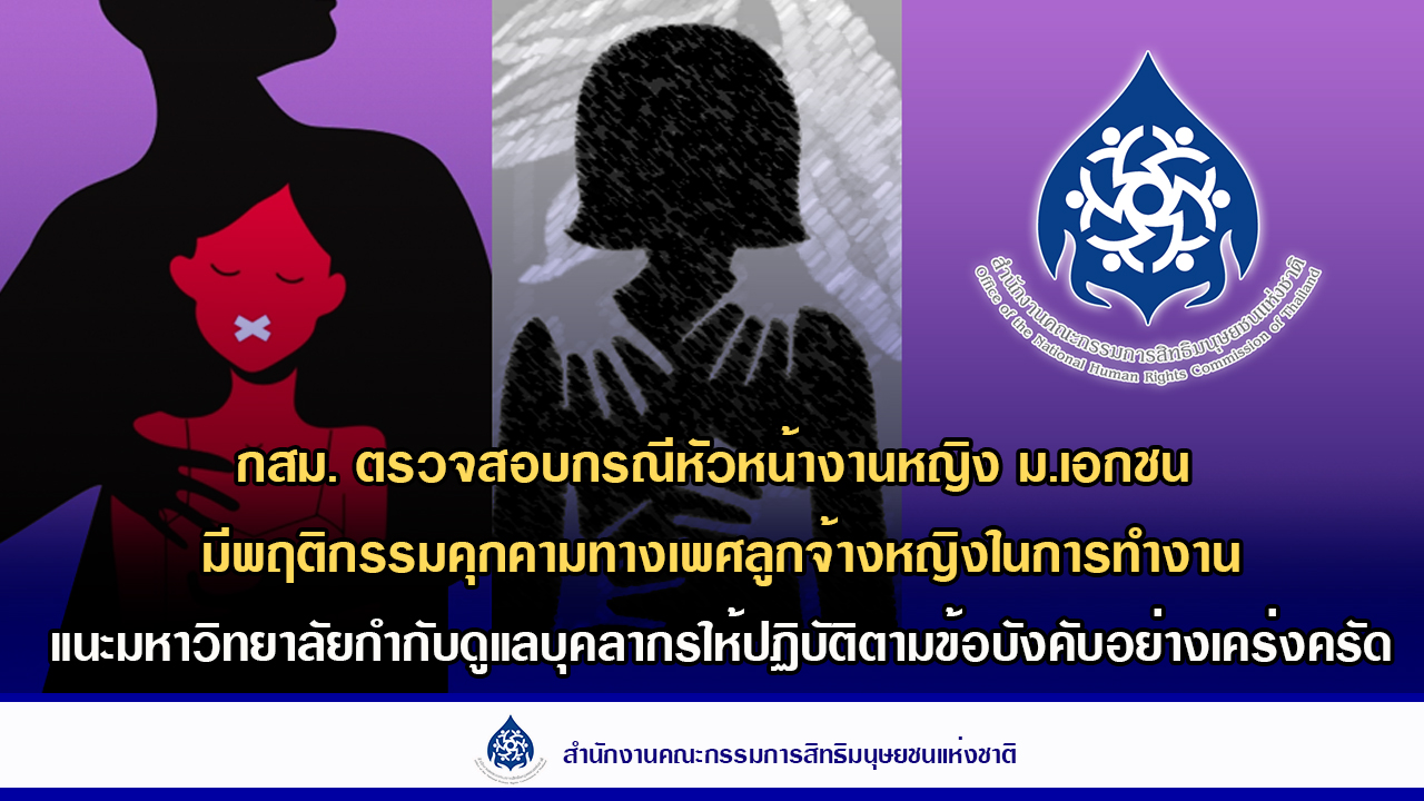 2. กสม. ตรวจสอบกรณีหัวหน้างานหญิงมหาวิทยาลัยเอกชนแห่งหนึ่งมีพฤติกรรมคุกคามทางเพศลูกจ้างหญิงในการทำงาน แนะมหาวิทยาลัยกำกับดูแลบุคลากรให้ปฏิบัติตามข้อบังคับอย่างเคร่งครัด
