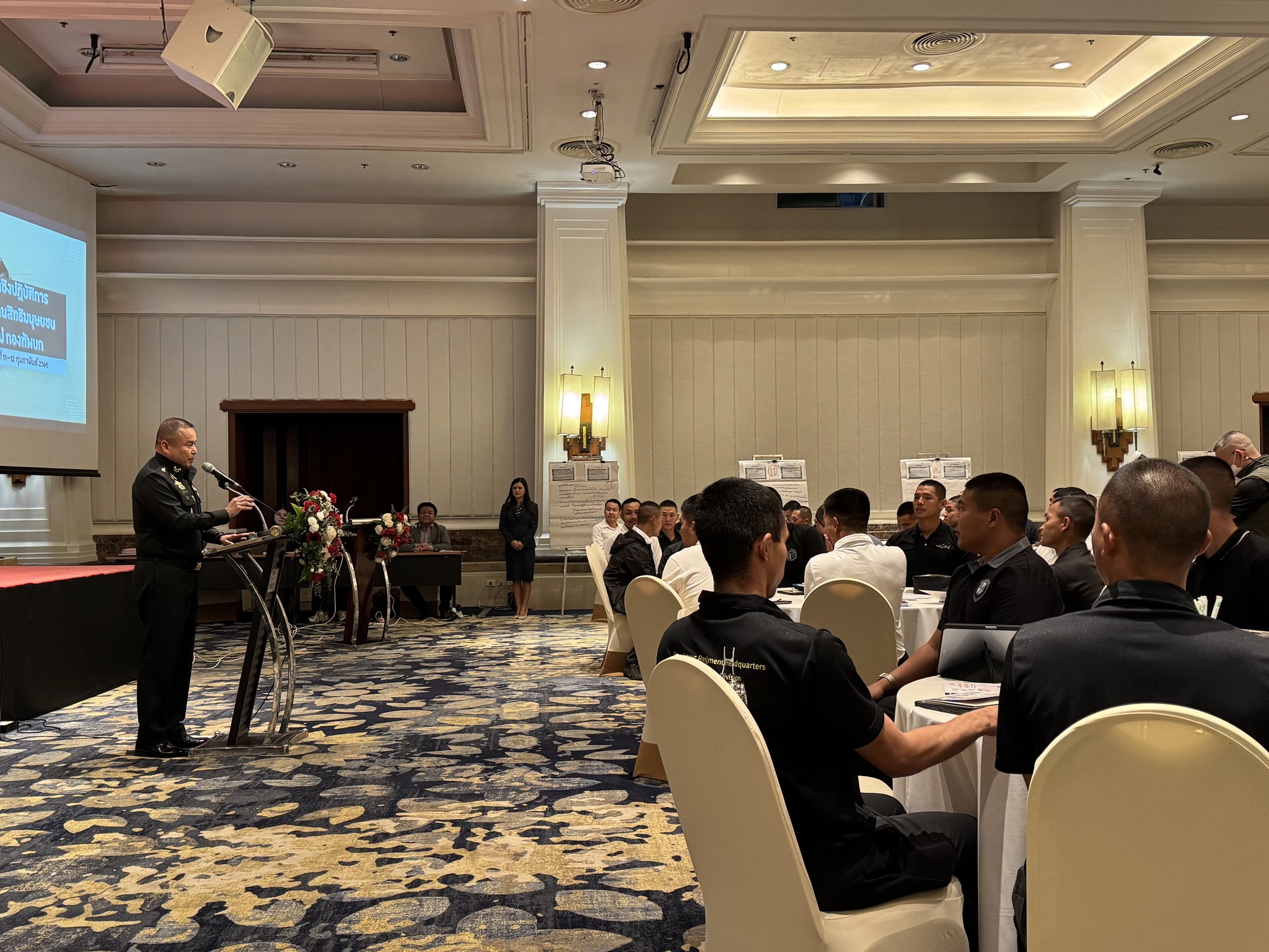 การอบรมเริ่มต้นด้วยการบรรยายหัวข้อ “บทบาทของกองทัพบกในการพัฒนาการฝึกทหารใหม่บนพื้นฐานของหลักสิทธิมนุษยชน” โดยสะท้อนความท้าทายของการฝึกในบริบทสังคมปัจจุบัน ทั้งด้านร่างกาย จิตใจ อารมณ์ และการปรับตัวของทหารใหม่ ครูฝึกจึงต้องทำหน้าที่มากกว่า “ผู้ควบคุมระเบียบวินัย” แต่เป็น “ครูพี่เลี้ยง” ที่ผสานวินัยทหารกับวิธีการฝึกที่เหมาะสม คำนึงถึงความปลอดภัยและเคารพสิทธิมนุษยชน