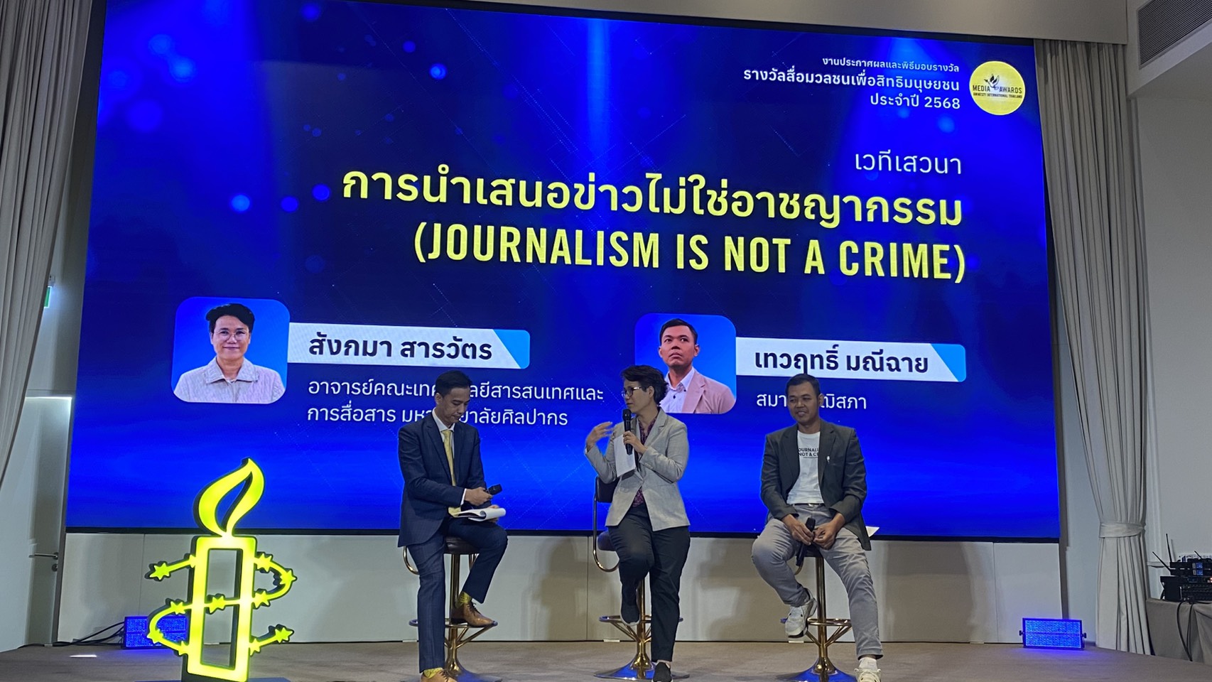 เมื่อวันที่ 28 กุมภาพันธ์ 2569 ที่โรงแรมเบสท์เวสเทิร์น จตุจักร กรุงเทพฯ นางสาวศยามล ไกรยูรวงศ์ คณะกรรมการสิทธิมนุษยชนแห่งชาติ พร้อมด้วยนางสาวกนกวรรณ ขวัญดี ผู้อำนวยการสำนักส่งเสริมการเคารพสิทธิมนุษยชน และเจ้าหน้าที่สำนักงานคณะกรรมการสิทธิมนุษยชนแห่งชาติ (สำนักงาน กสม.) เข้าร่วมงานมอบรางวัลสื่อมวลชนดีเด่นด้านสิทธิมนุษยชน ประจำปี 2568 (Media Awards 2025) จัดโดย แอมเนสตี้ อินเตอร์เนชั่นแนล ประเทศไทย เพื่อยกย่องผลงานข่าว สารคดีเชิงข่าว คลิปวิดีโอออนไลน์ และภาพถ่ายในหัวข้อสิทธิมนุษยชน ที่นำเสนอประเด็นอย่างรอบด้าน เคารพศักดิ์ศรีความเป็นมนุษย์ และมีส่วนสำคัญในการทำให้สังคมเข้าถึงข้อเท็จจริง