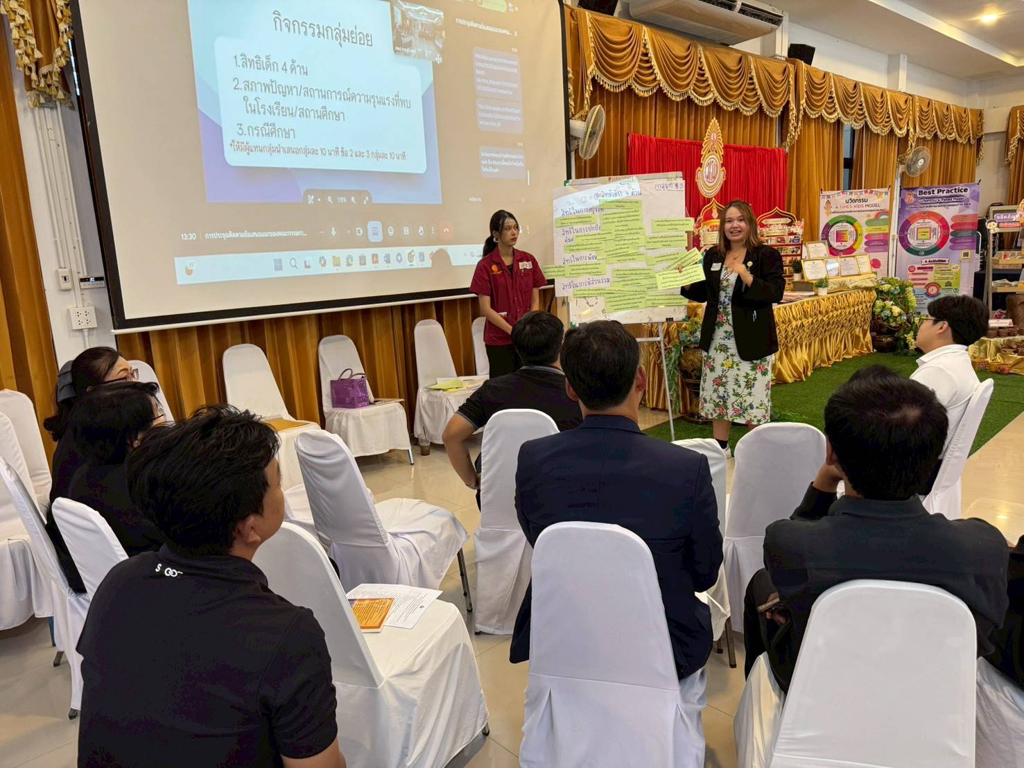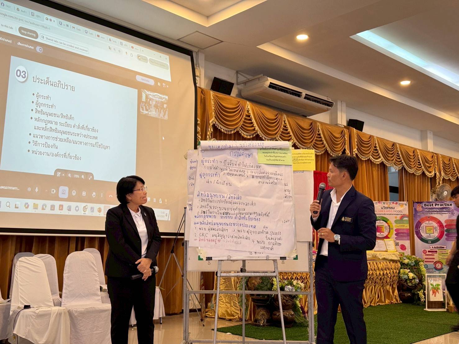 ช่วงที่ 2 กิจกรรมระดมความคิดเห็นเพื่อแลกเปลี่ยนเรียนรู้แนวทางป้องกันและแก้ไขปัญหาความรุนแรงในโรงเรียน โดยแบ่งผู้เข้าร่วมประชุม เป็น 4 กลุ่ม แต่ละกลุ่มได้ร่วมกิจกรรม ดังนี้ (1) ความรู้สิทธิเด็ก 4 ด้าน (2) สภาพปัญหา สถานการณ์ความรุนแรงที่พบในโรงเรียนหรือสถานศึกษา และ (3) กรณีศึกษาปัญหาความรุนแรงในโรงเรียนหรือสถานศึกษา เพื่อร่วมกันสะท้อนสภาพปัญหา อุปสรรค ข้อจำกัด และการป้องกันความรุนแรงในโรงเรียน ตลอดจนเพื่อเสริมสร้างความรู้ความเข้าใจต่อบทบาทหน้าที่ของผู้บริหารและครูในการสนับสนุน ช่วยเหลือ และส่งเสริมความเข้มแข็งของระบบการดูแลช่วยเหลือนักเรียนให้มีประสิทธิภาพมากยิ่งขึ้น