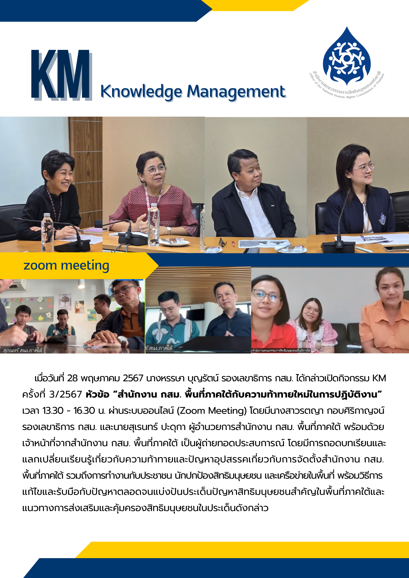 เมื่อวันที่ 28 พฤษภาคม 2567 เวลา 13.30 - 16.30 น. นางหรรษา บุญรัตน์ รองเลขาธิการคณะกรรมการสิทธิมนุษยชนแห่งชาติ (รองเลขาธิการ กสม.) กล่าวเปิดกิจกรรมแลกเปลี่ยนเรียนรู้ประสบการณ์ด้านการทำงาน (KM) ครั้งที่ 3/2567 หัวข้อ “สำนักงาน กสม. พื้นที่ภาคใต้กับความท้าทายใหม่ในการปฏิบัติงาน” ผ่านระบบออนไลน์ (Zoom Meeting) ในการนี้นางสาวรตญา กอบศิริกาญจน์ รองเลขาธิการ กสม. และนายสุเรนทร์ ปะดุกา ผู้อำนวยการสำนักงานคณะกรรมการสิทธิมนุษยชนแห่งชาติพื้นที่ภาคใต้ (สำนักงาน กสม. พื้นที่ภาคใต้) พร้อมด้วยเจ้าหน้าที่จากสำนักงาน กสม. พื้นที่ภาคใต้ เป็นผู้ถ่ายทอดประสบการณ์ โดยมีการถอดบทเรียนและแลกเปลี่ยนเรียนรู้เกี่ยวกับความท้าทายและปัญหาอุปสรรคเกี่ยวกับการจัดตั้งสำนักงาน กสม. พื้นที่ภาคใต้ รวมถึงการทำงานกับประชาชน นักปกป้องสิทธิมนุษยชน และเครือข่ายในพื้นที่ พร้อมวิธีการแก้ไขและรับมือกับปัญหาตลอดจนแบ่งปันประเด็นปัญหาสิทธิมนุษยชนสำคัญในพื้นที่ภาคใต้และแนวทางการส่งเสริมและคุ้มครองสิทธิมนุษยชนในประเด็นดังกล่าว