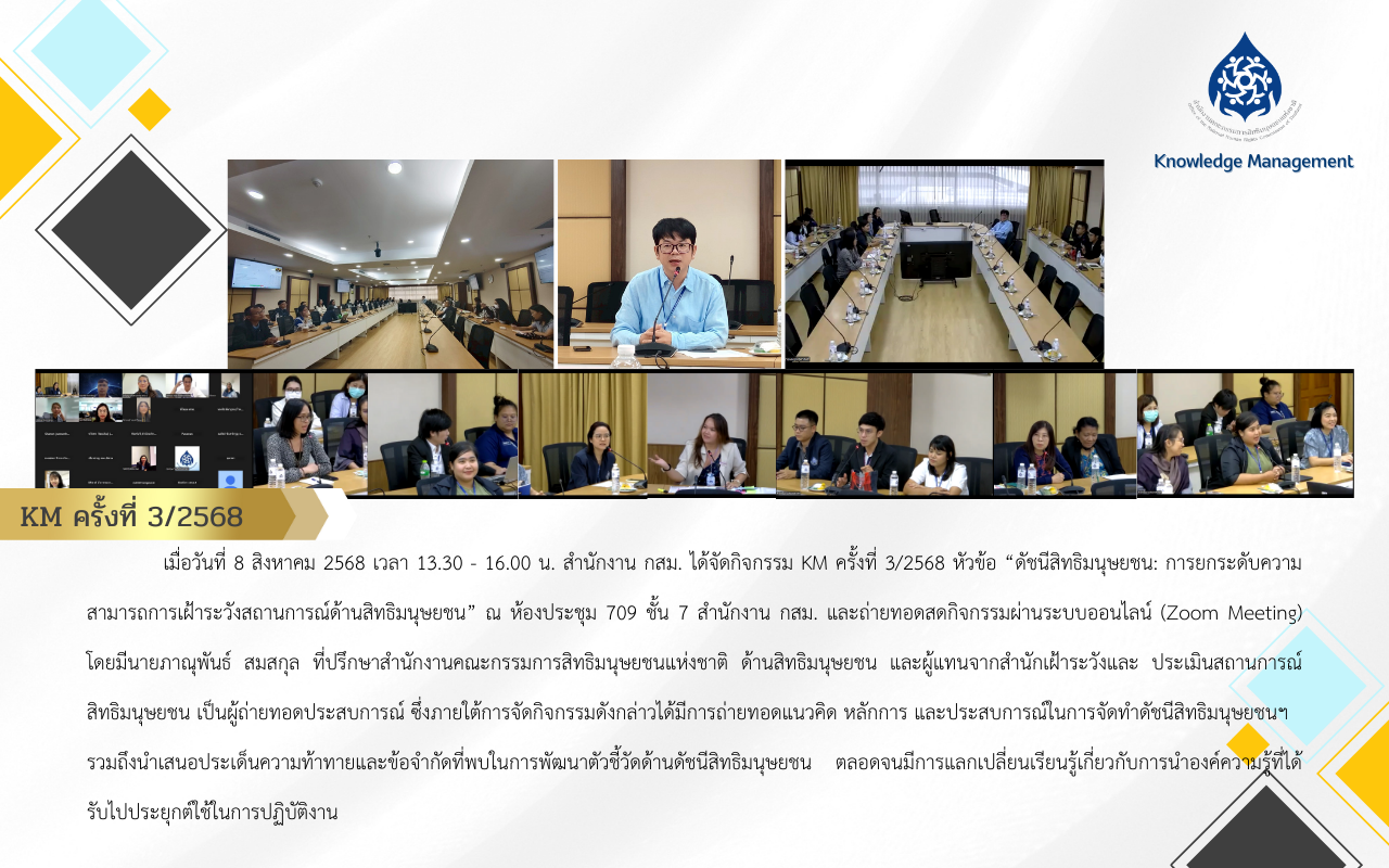 กิจกรรมถ่ายทอดประสบการณ์และแลกเปลี่ยนเรียนรู้ (KM) ครั้งที่ 3/2568 หัวข้อ “ดัชนีสิทธิมนุษยชน: การยกระดับความสามารถการเฝ้าระวังสถานการณ์ด้านสิทธิมนุษยชน”