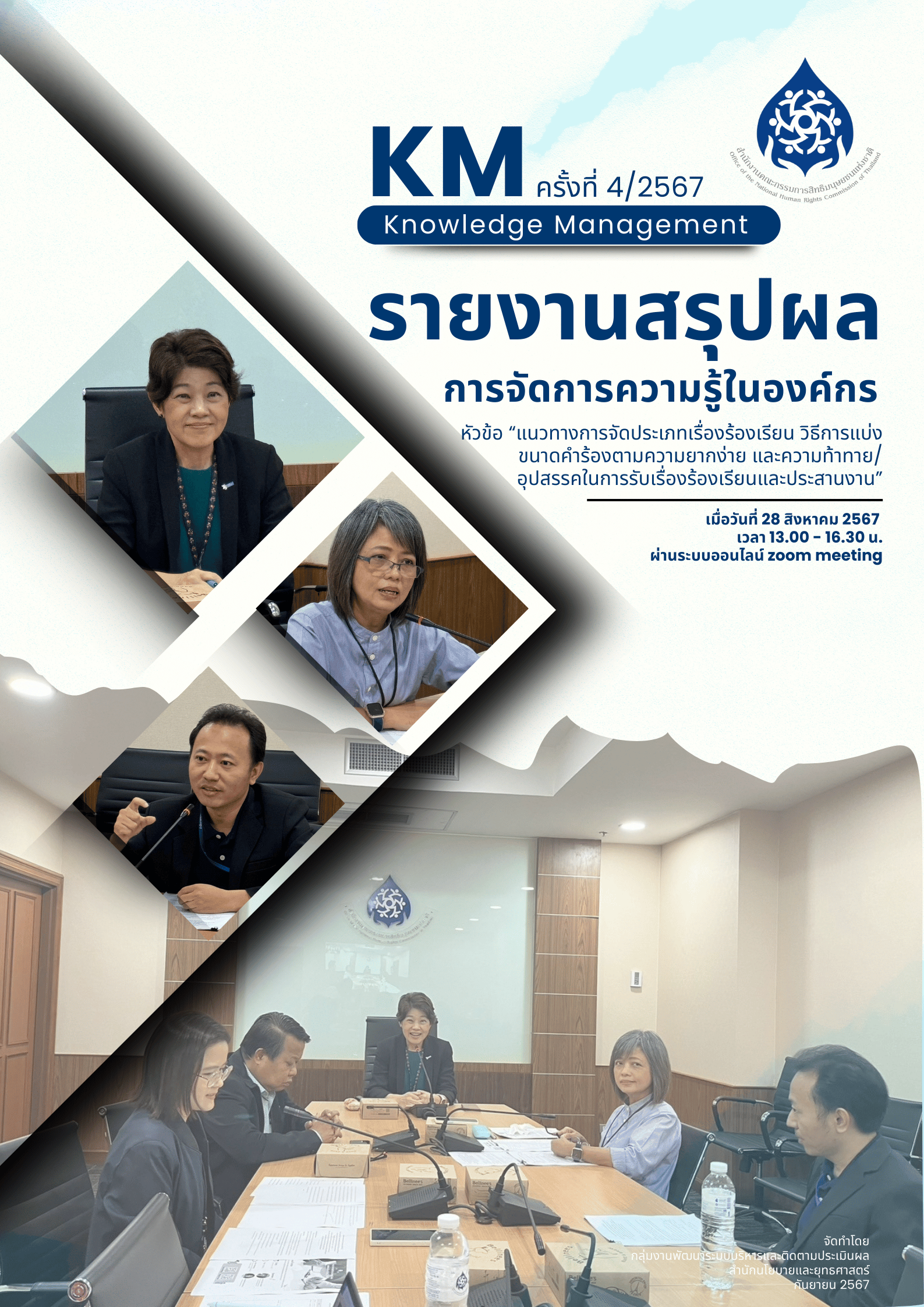 รายงานสรุปผลกิจกรรม KM ครั้งที่ 4/2567 หัวข้อ “แนวทางการจัดประเภทเรื่องร้องเรียน วิธีการแบ่งขนาดคำร้องตามความยากง่าย และความท้าทาย/อุปสรรคในการรับเรื่องร้องเรียนและประสานงาน”