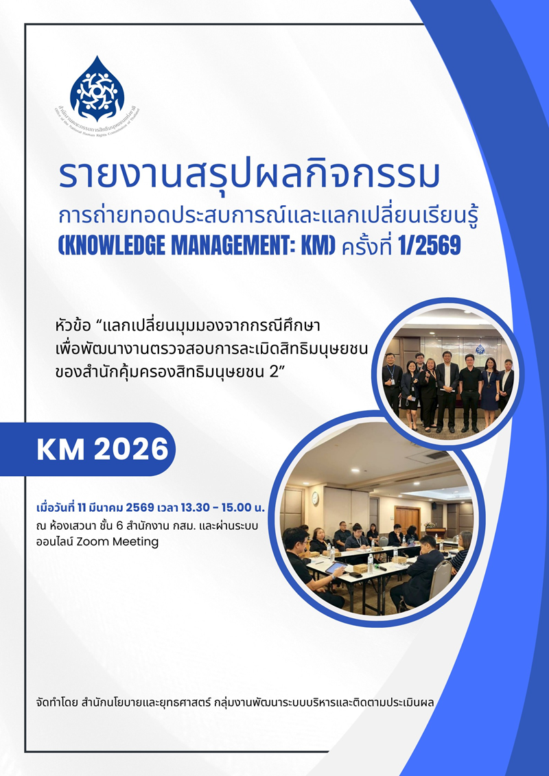 สรุปผลกิจกรรม KM ครั้งที่ 1/2569 หัวข้อ “แลกเปลี่ยนมุมมองจากกรณีศึกษาเพื่อพัฒนางานตรวจสอบการละเมิดสิทธิมนุษยชนของ สำนักคุ้มครองสิทธิมนุษยชน 2”