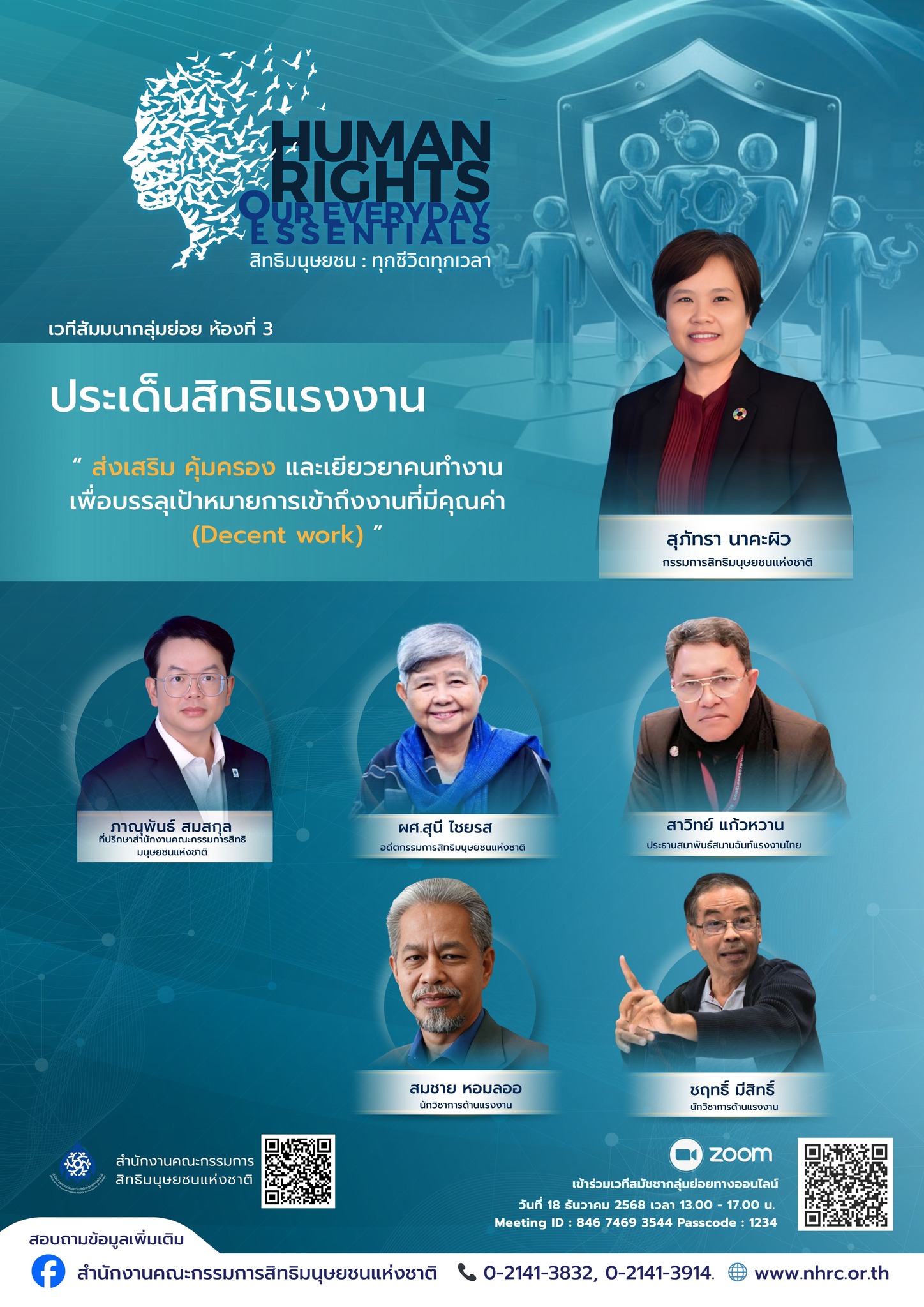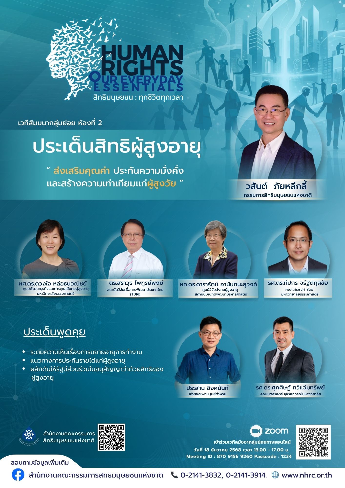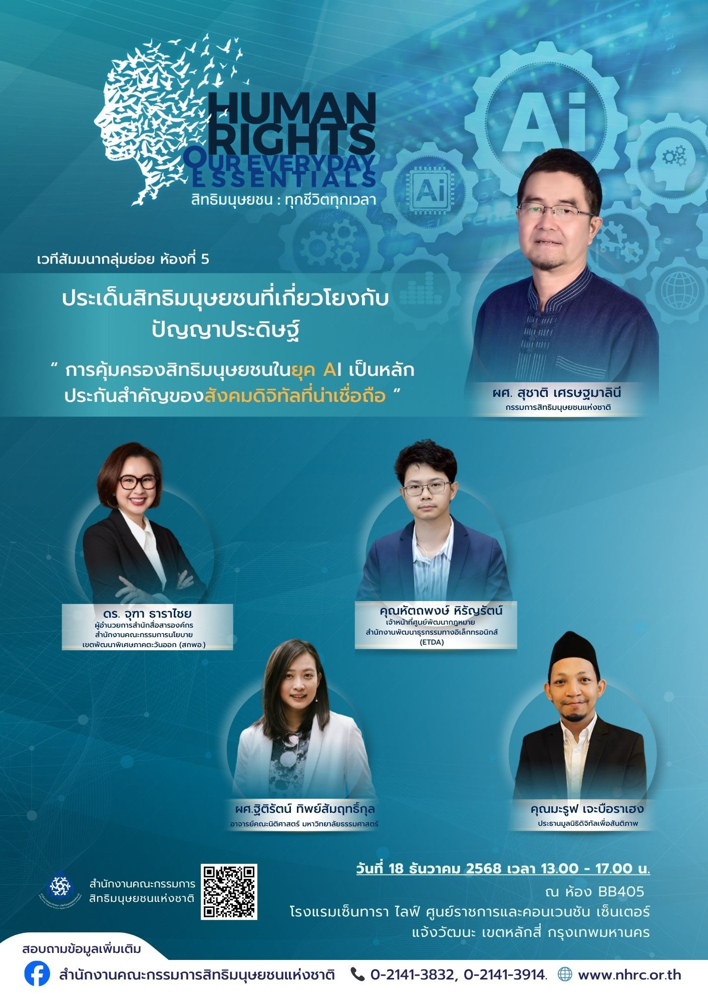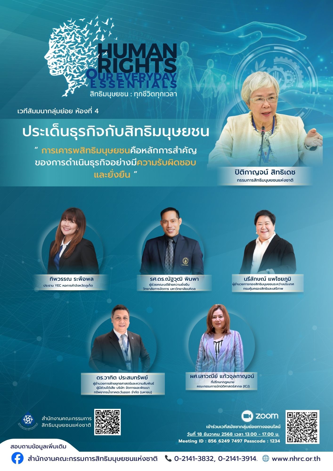 วันที่ 18 ธันวาคม 2568 คณะกรรมการสิทธิมนุษยชนแห่งชาติ (กสม.) จัดงานสมัชชาสิทธิมนุษยชน เนื่องในวันสิทธิมนุษยชนสากล ประจำปี 2568 ภายใต้แนวคิด “Human Rights: Our Everyday Essential สิทธิมนุษยชน: ทุกชีวิตทุกเวลา”  เพื่อเป็นกลไกสำคัญในการส่งเสริมความร่วมมือกับภาคีเครือข่ายทุกภาคส่วน เป็นพื้นที่กลางในการรับฟังความคิดเห็น การแลกเปลี่ยนทัศนะ และการร่วมกันจัดทำข้อเสนอแนะเชิงนโยบายเพื่อการส่งเสริมและคุ้มครองสิทธิมนุษยชน