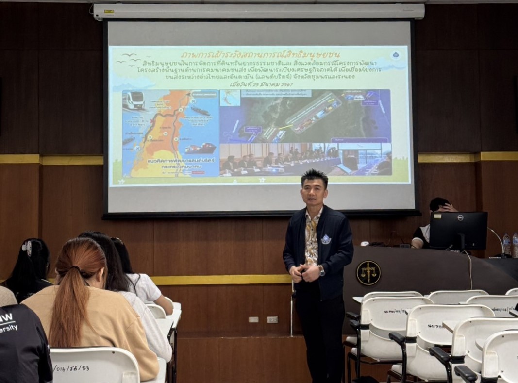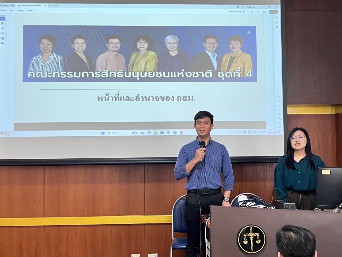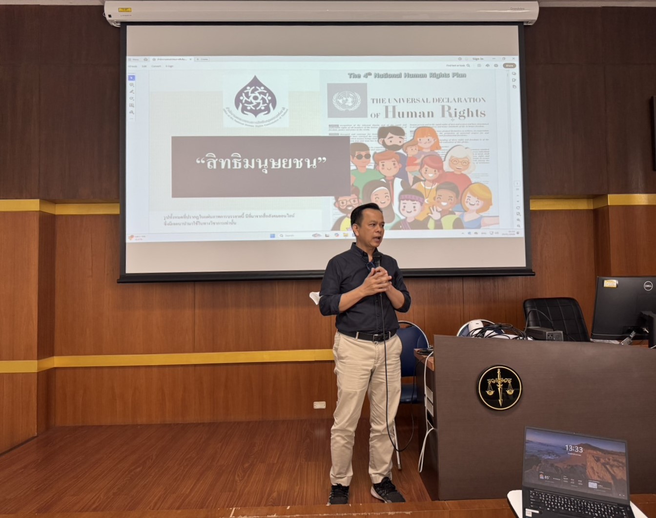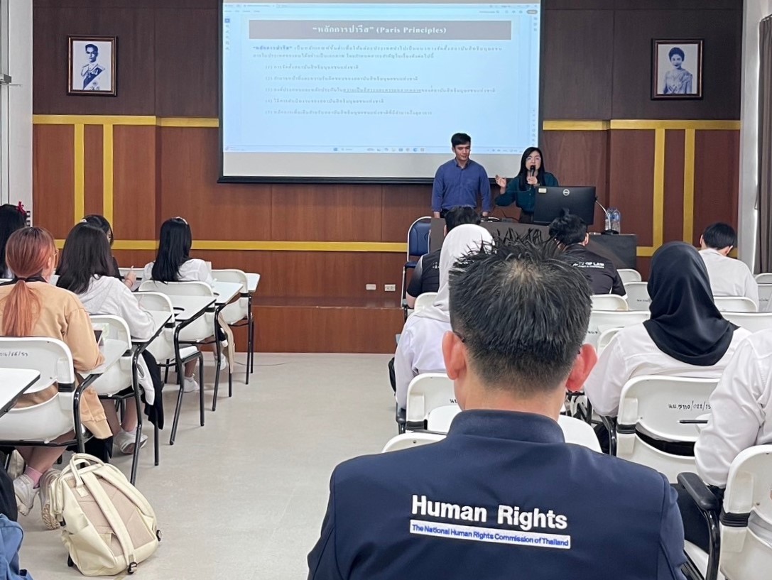เมื่อวันที่ 29 มกราคม 2568 เวลา 13.30 น. ที่ห้อง 203 ชั้น 2 คณะนิติศาสตร์ มหาวิทยาลัยสงขลานครินทร์ อำเภอหาดใหญ่ จังหวัดสงขลา นายสุเรนทร์  ปะดุกา ผู้อำนวยการสำนักงานคณะกรรมการสิทธิมนุษยชนแห่งชาติพื้นที่ภาคใต้ (สำนักงาน กสม.พื้นที่ภาคใต้) พร้อมด้วยเจ้าหน้าที่สำนักงาน กสม.พื้นที่ภาคใต้ ร่วมเป็นวิทยากรบรรยายให้ความรู้ด้านการส่งเสริมและคุ้มครองสิทธิมนุษยชน ในหัวข้อ หลักการสิทธิมนุษยชนการคุ้มครองสิทธิมนุษยชน การส่งเสริมและเฝ้าระวังสถานการณ์สิทธิมนุษยชนในพื้นที่ภาคใต้ ให้แก่นักศึกษาคณะนิติศาสตร์ ชั้นปีที่ 3 มหาวิทยาลัยสงขลานครินทร์ จำนวน 30 คน เพื่อให้นักศึกษา รายวิชา 870 - 355 สิทธิมนุษยชน ได้มีความรู้ ความเข้าใจบทบาทหน้าที่ของคณะกรรมการสิทธิมนุษยชนแห่งชาติ (กสม.) และประสบการณ์ในการปฏิบัติงานของเจ้าหน้าที่สำนักงาน กสม.พื้นที่ภาคใต้ และสามารถนำความรู้ด้านสิทธิมนุษยชนที่ได้รับไปพัฒนา ประยุกต์ใช้กับหลักกฎหมาย การดำรงชีวิตประจำวันในสังคม ชุมชน ในการปกป้องสิทธิของตนเอง ไม่ไปละเมิดสิทธิของผู้อื่น และเผยแพร่หลักการสิทธิมนุษยชนให้กับชุมชน เพื่อเสริมสร้างสังคมแห่งการเคารพสิทธิมนุษยชนต่อไป