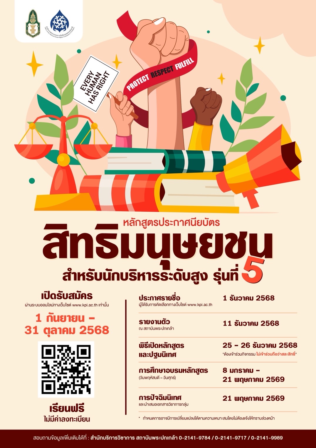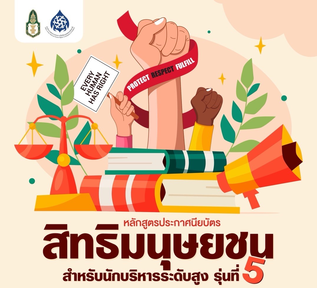 สำนักงานคณะกรรมการสิทธิมนุษยชนแห่งชาติ ร่วมกับสถาบันพระปกเกล้า ขอเชิญผู้บริหารภาครัฐ ภาคเอกชน ภาคประชาสังคม และสื่อมวลชน สมัครเข้ารับการอบรมหลักสูตรประกาศนียบัตรสิทธิมนุษยชนสำหรับนักบริหารระดับสูง (ปสม.) รุ่นที่ 5